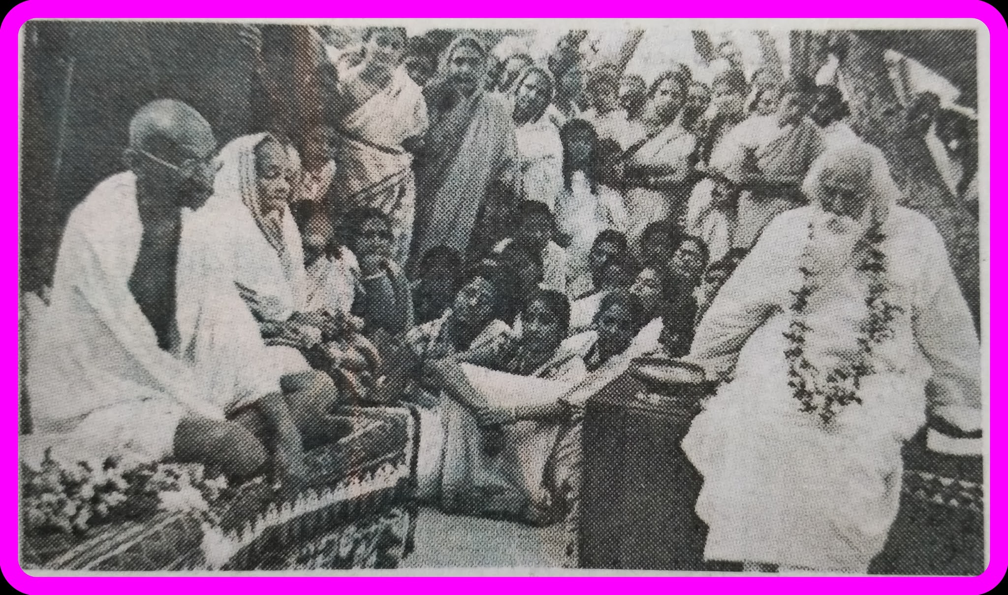 শান্তিনিকেতনে ১৯৪০ খ্রিস্টাব্দের ১৮ ফেব্রুয়ারি রবীন্দ্রনাথের আতিথেয়তায় মহাত্মা গান্ধি ও তাঁর স্ত্রী কস্তুরবা গান্ধি |