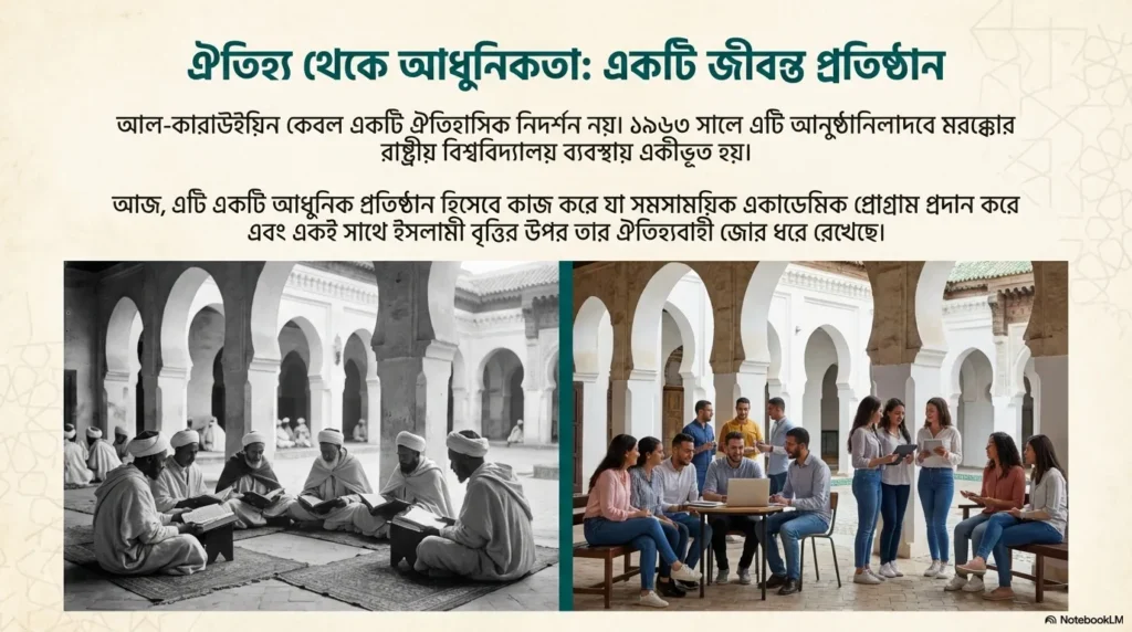 অনেকে ভাবতে পারেন এত পুরনো প্রতিষ্ঠান কি এখনো টিকে আছে? উত্তর হলো—হ্যাঁ। ১৯৬৩ সালে al-Qarawiyyin-কে মরক্কোর State University System-এর অন্তর্ভুক্ত করা হয়।