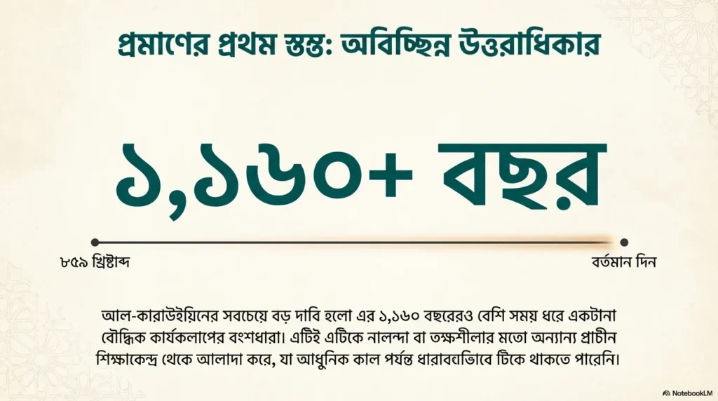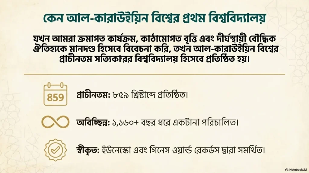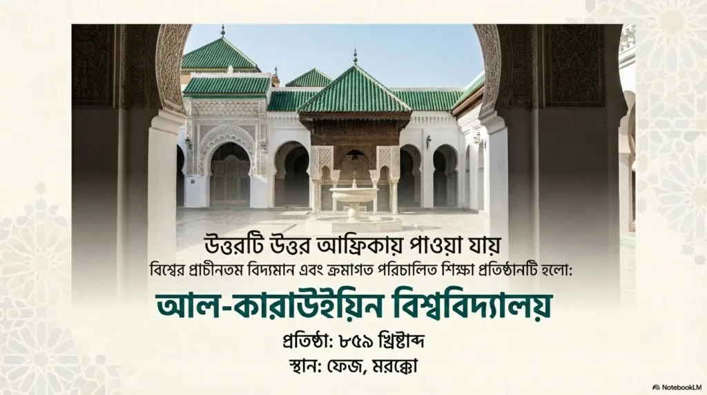 যদি আমরা মধ্যযুগীয় ইউরোপীয় মডেলের (Medieval European model) বাইরে তাকাই এবং এমন একটি শিক্ষা প্রতিষ্ঠান খুঁজি যেটা প্রাচীনকাল থেকে আজ পর্যন্ত Continuously Operating (ধারাবাহিকভাবে চালু) আছে, তবে বিশ্বের বেশিরভাগ Scholars এবং অফিসিয়াল বডি যার নাম নেয়, সেটি হলো— মরক্কোর ফেজ শহরে অবস্থিত University of al-Qarawiyyin।