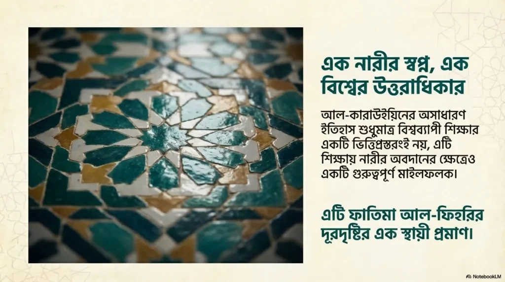 পরিশেষে বলা যায়, যদি আমরা Continuous Operation এবং Structured Scholarship-এর কথা বিবেচনা করি, তবে University of al-Qarawiyyin-ই বিশ্বের সর্বপ্রথম সত্যিকারের ইউনিভার্সিটি। আর এই অসাধারণ ইতিহাসের পেছনে যার অবদান সবচেয়ে বেশি, তিনি হলেন একজন নারী— Fatima al-Fihri। নারী শিক্ষার অগ্রগতি এবং ক্ষমতায়নে এটি ইতিহাসের একটি অনন্য মাইলফলক।