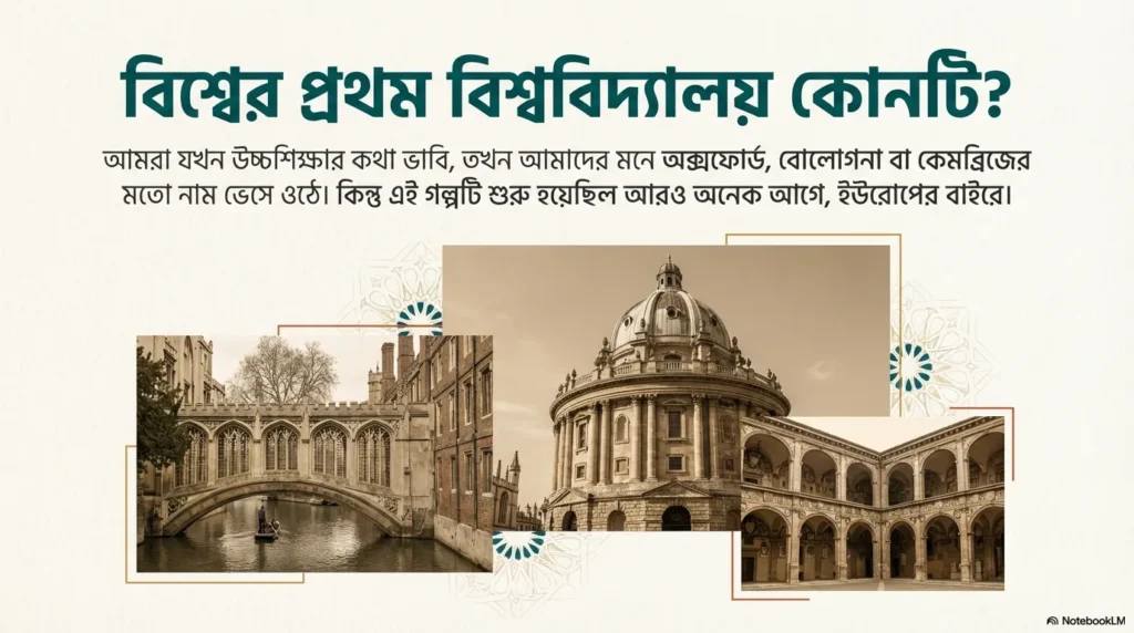 যখন আমরা প্রশ্ন করি, “এই বিশ্বের প্রথম ইউনিভার্সিটি কোনটি?”—তখন এর উত্তরটা আসলে নির্ভর করে আমরা ‘University’ শব্দটাকে কীভাবে Define করছি তার ওপর। আধুনিক মডেলের ইউনিভার্সিটি আসার অনেক আগেই পৃথিবীর বিভিন্ন কালচারে Higher Learning-এর সুশৃঙ্খল ব্যবস্থা ছিল। প্রতিটি শিক্ষা প্রতিষ্ঠানেরই নিজস্ব ঐতিহ্য বা Legacy রয়েছে।