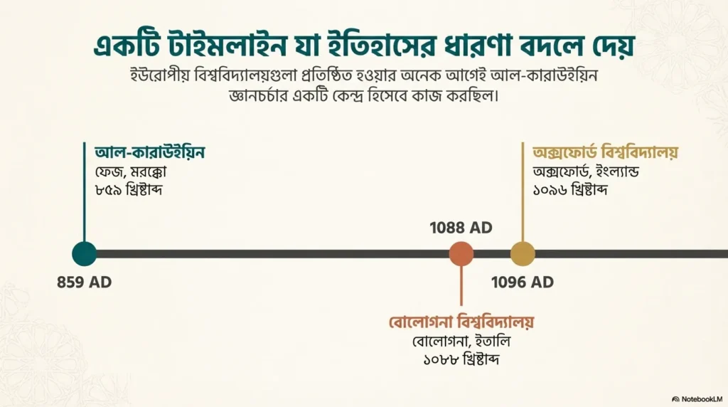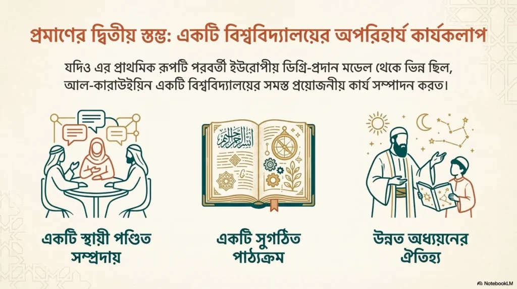 ইউরোপের বিখ্যাত Bologna বা Oxford University প্রতিষ্ঠিত হওয়ার প্রায় ২০০ বছর আগে থেকেই al-Qarawiyyin-এ পুরোদমে শিক্ষা কার্যক্রম চলছিল। যদিও শুরুর দিকে এর ফরম্যাট ইউরোপিয়ান Degree-granting মডেলের মতো ছিল না, তবুও একটি ইউনিভার্সিটির সব Essential Functions এটি পালন করত: