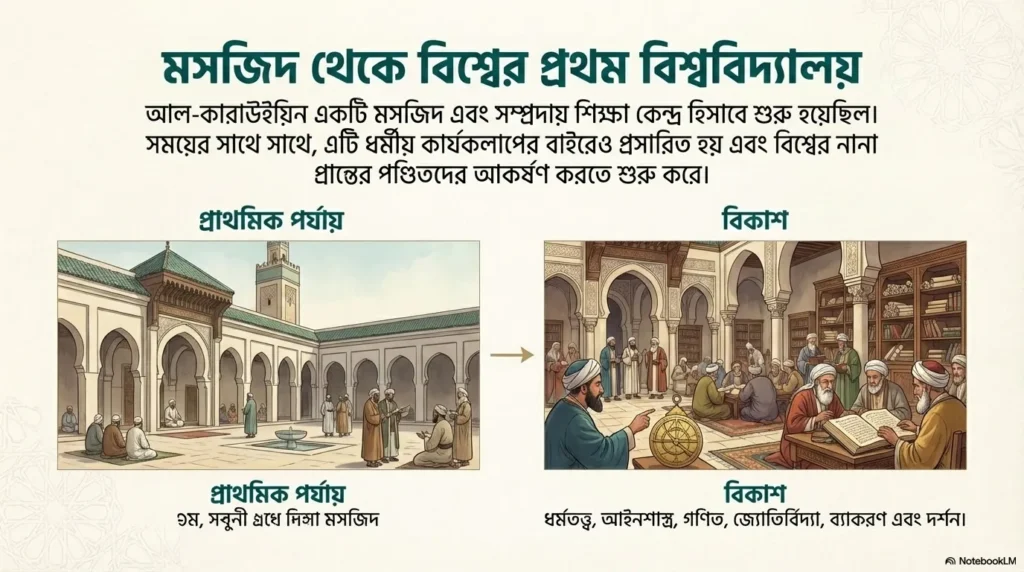 শুরুতে al-Qarawiyyin ছিল মূলত একটি মসজিদ এবং Community Learning Centre। কিন্তু সময়ের সাথে সাথে এটি শুধুমাত্র ধর্মীয় শিক্ষার গণ্ডিতে আটকে থাকেনি। এর সুনাম ছড়িয়ে পড়ার সাথে সাথে দূর-দূরান্ত থেকে স্কলাররা এখানে আসতে শুরু করেন। ধীরে ধীরে এখানে Theology-র পাশাপাশি Jurisprudence, Mathematics, Astronomy, Grammar এবং Philosophy-র মতো বিষয়গুলোতেও পাঠদান শুরু হয়। এভাবেই এটি বিশ্বের অন্যতম প্রভাবশালী একটি Scholarship Centre-এ পরিণত হয়।